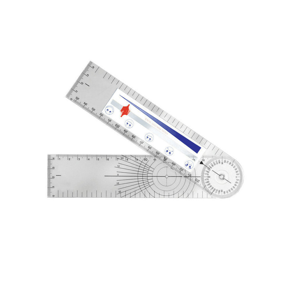 -Em plástico transparente, para uso profissional. -Com escala circular. -Usado para medir a amplitude de movimento das articulações: cotovelos, joelhos e dedos. -Possui escala visual de dor.